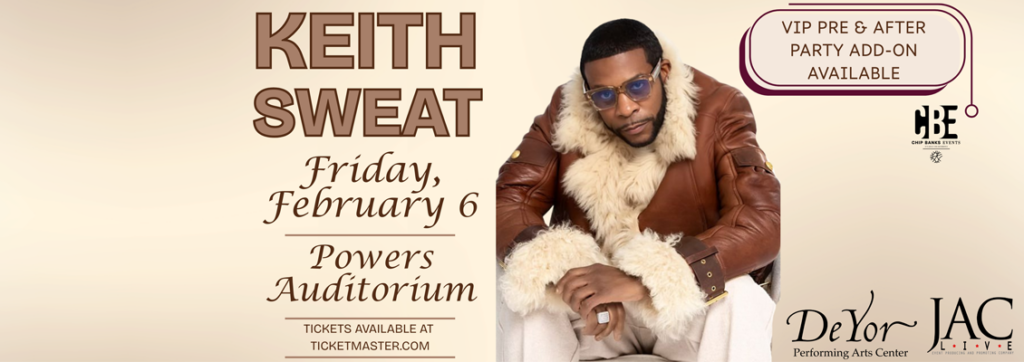 JAC LIVE and the DeYor Performing Arts Center are thrilled to welcome Keith Sweat on Friday, February 6th inside Powers Auditorium. Doors open at 7:00 PM with the show beginning at 8:00 PM.